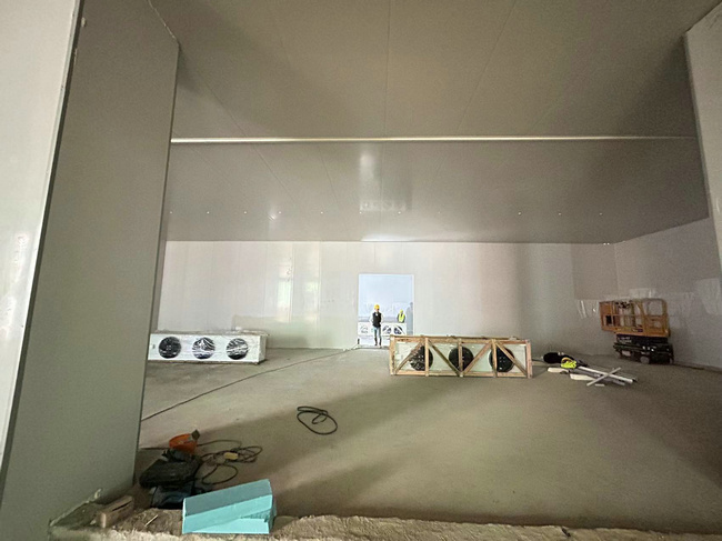 此外,冷庫保溫材料采用的是125mm聚氨酯雙面彩鋼板保溫庫板,該庫板節(jié)能環(huán)保,阻熱率極高,從而在確保實現(xiàn)冷庫穩(wěn)定低溫環(huán)境的同時極大地降低了后期運行成本。庫內照明選用的歐普LED冷庫專用防潮、防爆庫燈,外形美觀、照明度好??刂葡到y(tǒng)采用西門子微電腦大屏控制器系統(tǒng),并且具備溫濕度報警,數(shù)據(jù)記錄,手機客戶端監(jiān)控等功能。